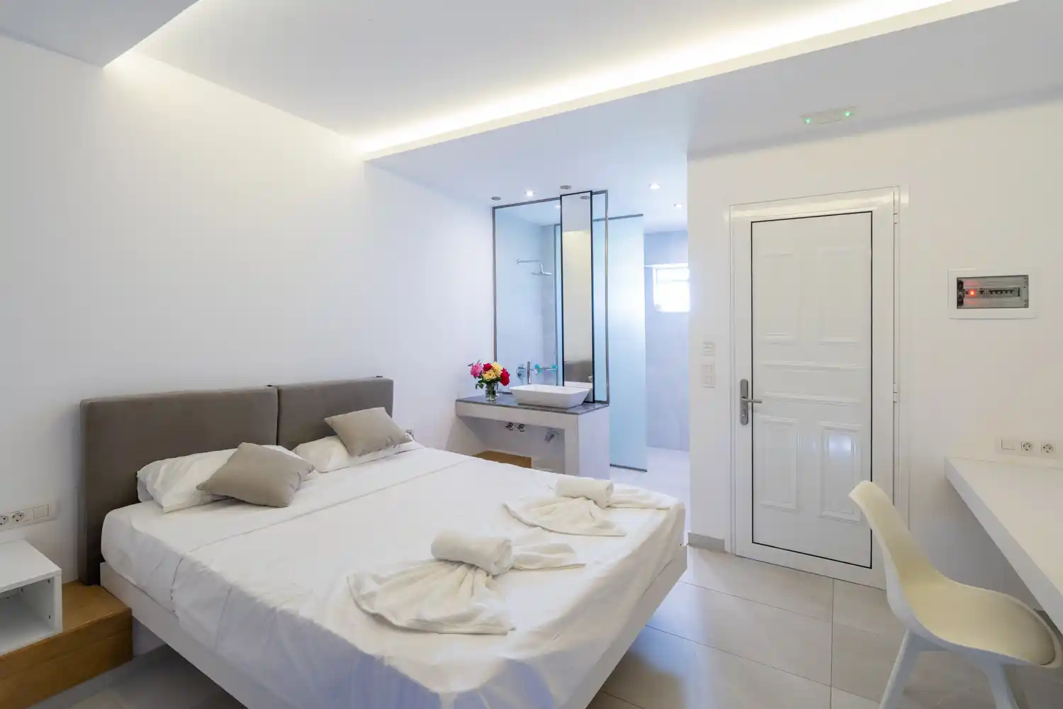 Experience ultimate luxury with direct access to a shared pool and premium living space. Experience the ultimate in comfort and style. Designed with a harmonious blend of traditional Greek aesthetics and modern luxury, this room offers a serene retreat after a day under the Aegean sun. Enjoy your private balcony with breathtaking views.